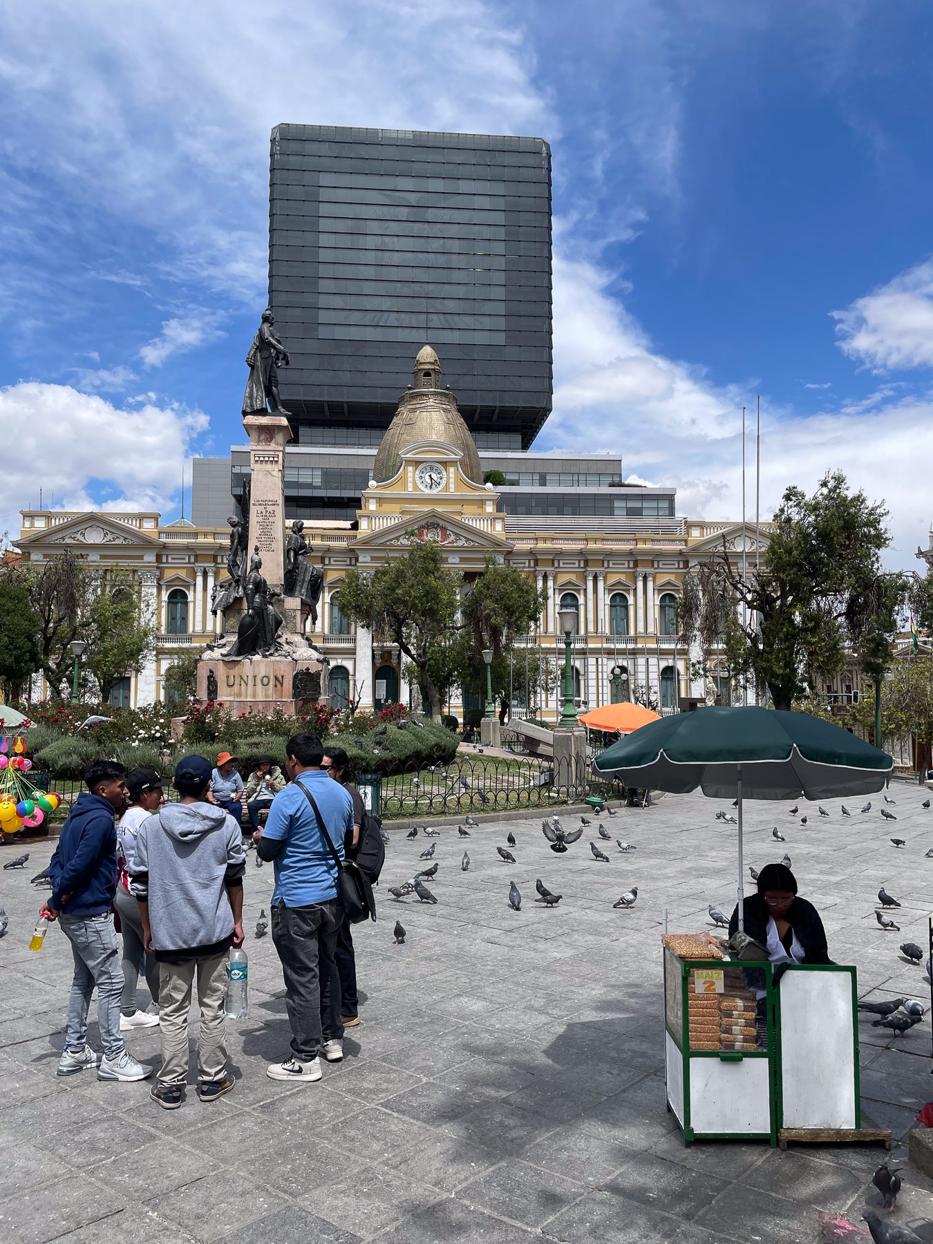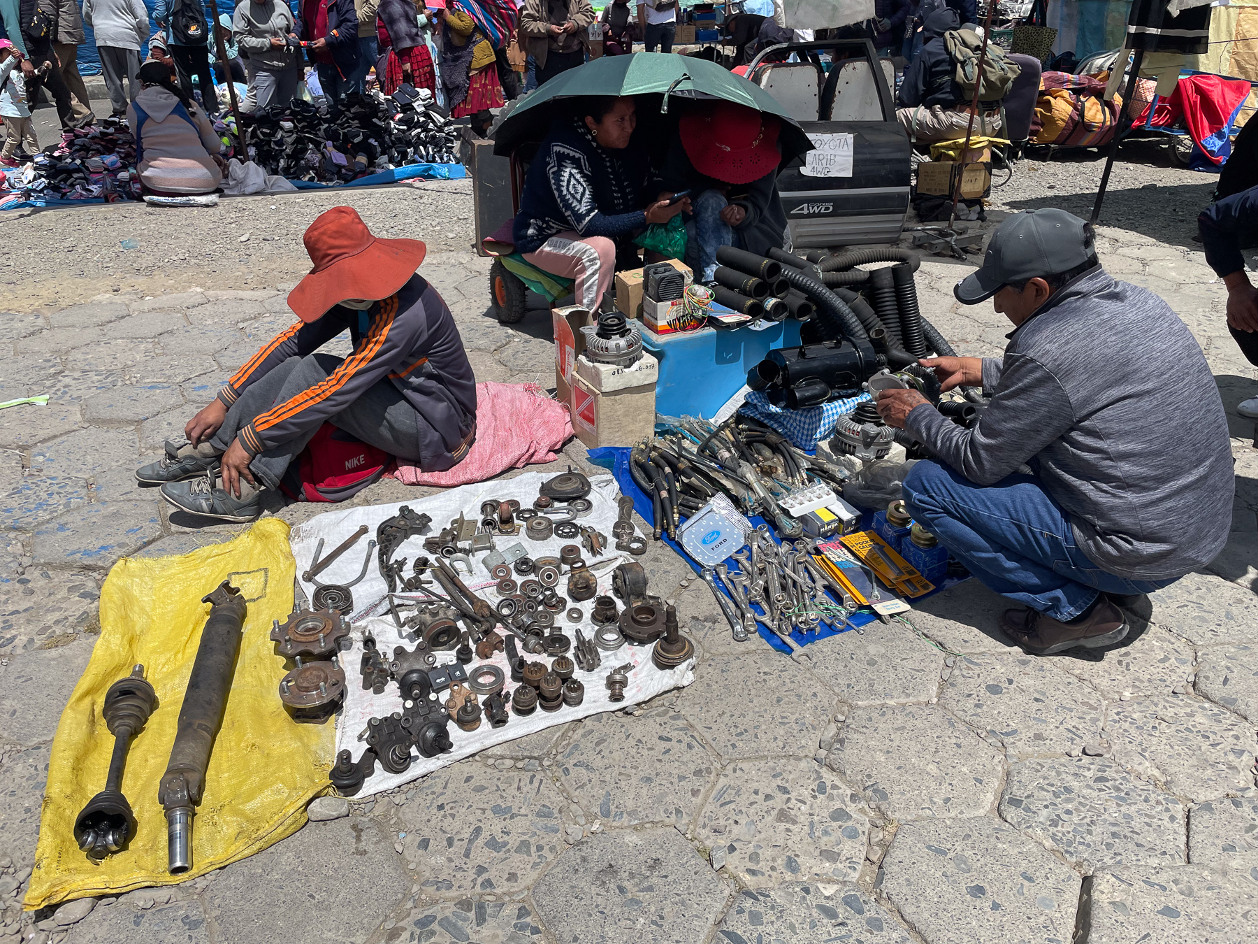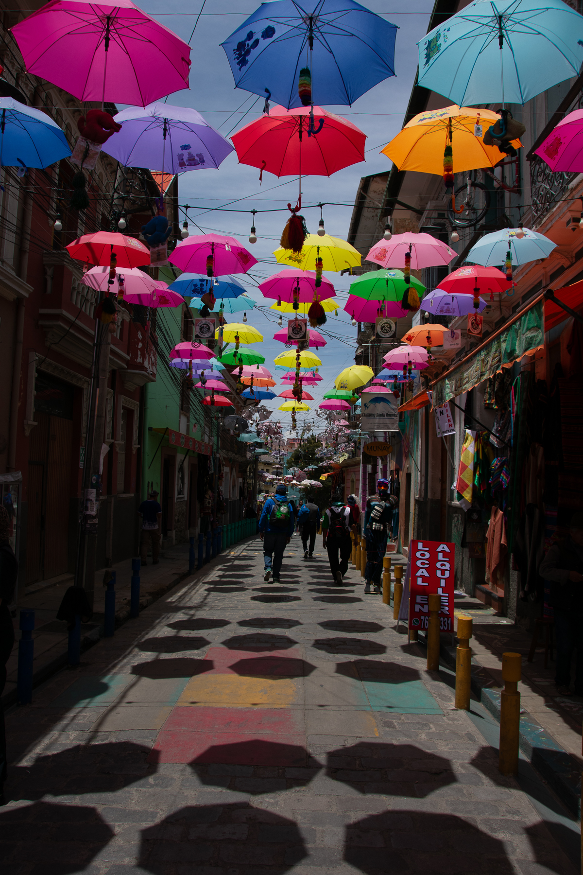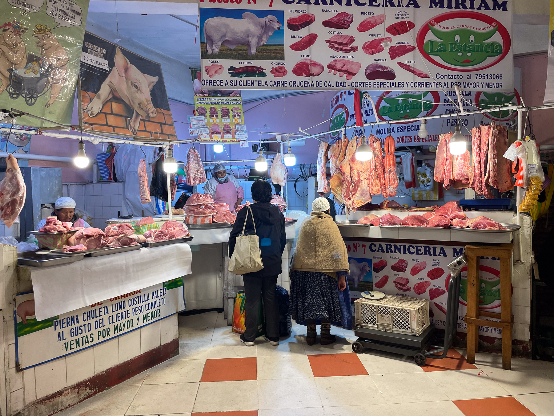 Goed anderhalf uur later sta ik in de toeristische straat met de parapluutjes, met veel winkeltjes. Daar is ook de heksenmarkt, die o.a. llama fetussen en thee tegen covid verkopen. Ik ga effe checken naar een tour organisatie om een trekking mee te doen, maar dat gebouw staat te koop. Mogelijks hebben ze niet genoeg thee tegen covid gedronken. Ik ga nog even naar een uitkijkpunt, maar het probleem daarmee is dat die hoog ligt, en dat klimmen blijft wel lastig hier op 4000 meter. Voor de grap passeer ik nog eens aan de markt. Het is rustig, dus ik moet een vrouwtje wakker maken, maar ze is direct wakker genoeg om mij in de zak te zetten bij de prijs van een mango. Bij het vlees kijk ik enkel eens en bedenk ik dat ik misschien toch iets meer voor de vegetarische optie moet gaan, als die er iss. Daarna terug naar guesthouse, voor wat relaxen.