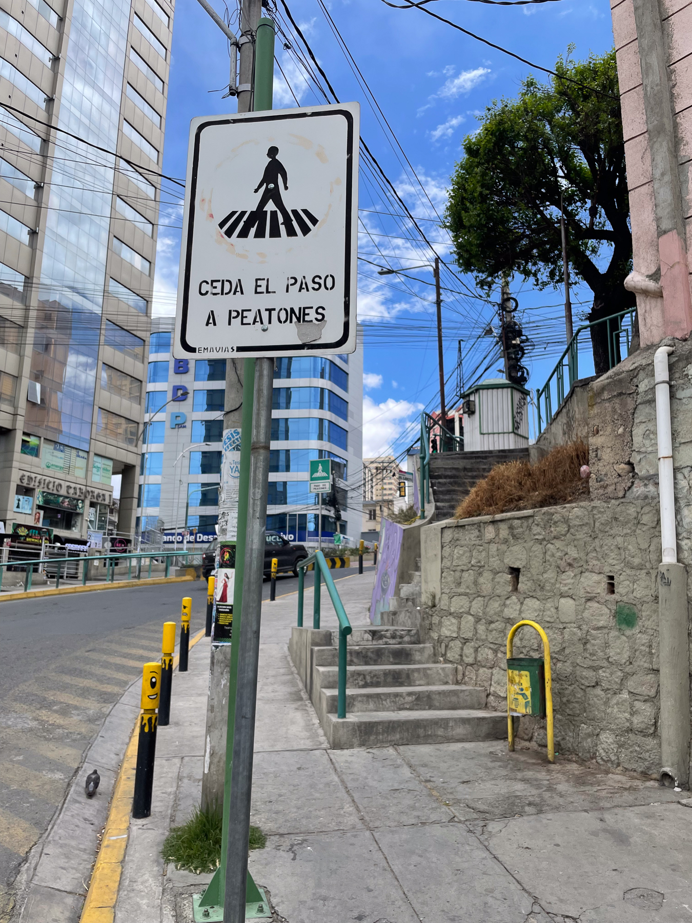 Ik ga eens zien naar het centraal station, maar daar is duidelijk al jaren geen trein meer gepasseerd. De enige 2 wagons die er staan, zijn veranderd in restaurantjes. Daarna gaat het verder met de teleferico en de stad blijft veranderen. Uiteindelijk ben ik aan mijn eindpunt en ga ik wat eten en drinken. Ik kom nog het grappigste verkeersbord tegen dat ze hier hebben, eentje dat de bestuurders aanspoort om voetgangers voorrang te geven. De regel hier, en overal in Zuid-Amerika lijkt mij, is dat ze je niet actief gaan proberen omver te rijden, maar dat is het dan ook wel. Na die lachbui begeef ik mij terug naar de guesthouse, voor nog wat admin en om mijn rugzak te maken voor de trektocht van morgen.