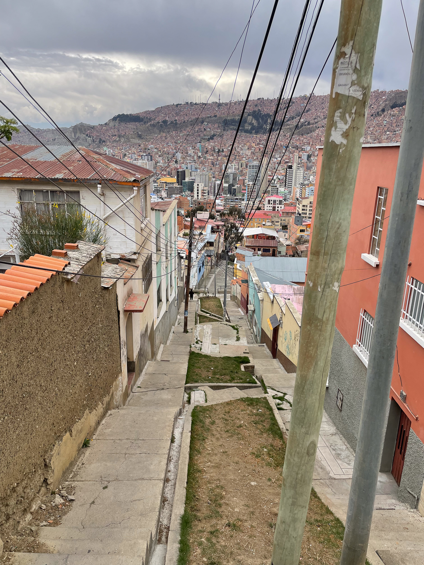 Slapen blijft moeilijk, maar de rode wijn heeft geholpen denk ik. Na een mager ontbijt vertrek ik terug vol goede moed. Ik ga eerst langs bij een ander tour agentschap om een trektocht te boeken voor morgen. Daarna begin ik aan een rondje van de teleferico’s. Ik moet opgeven welke lijnen ik allemaal wil doen, ik kies er 5 en ben ervan af voor 2 euro. Eerst even naar El Alto, de nieuwe stad die 300 meter hoger ligt dan centraal La Paz. Mooie uitzichten van daar en het is zondag, dus er is een megagrote markt aan de gang. Gewaarschuwd voor diefstal ga ik er niet te diep in, ik moet tenslotte ook verder met mijn teleferico toer.