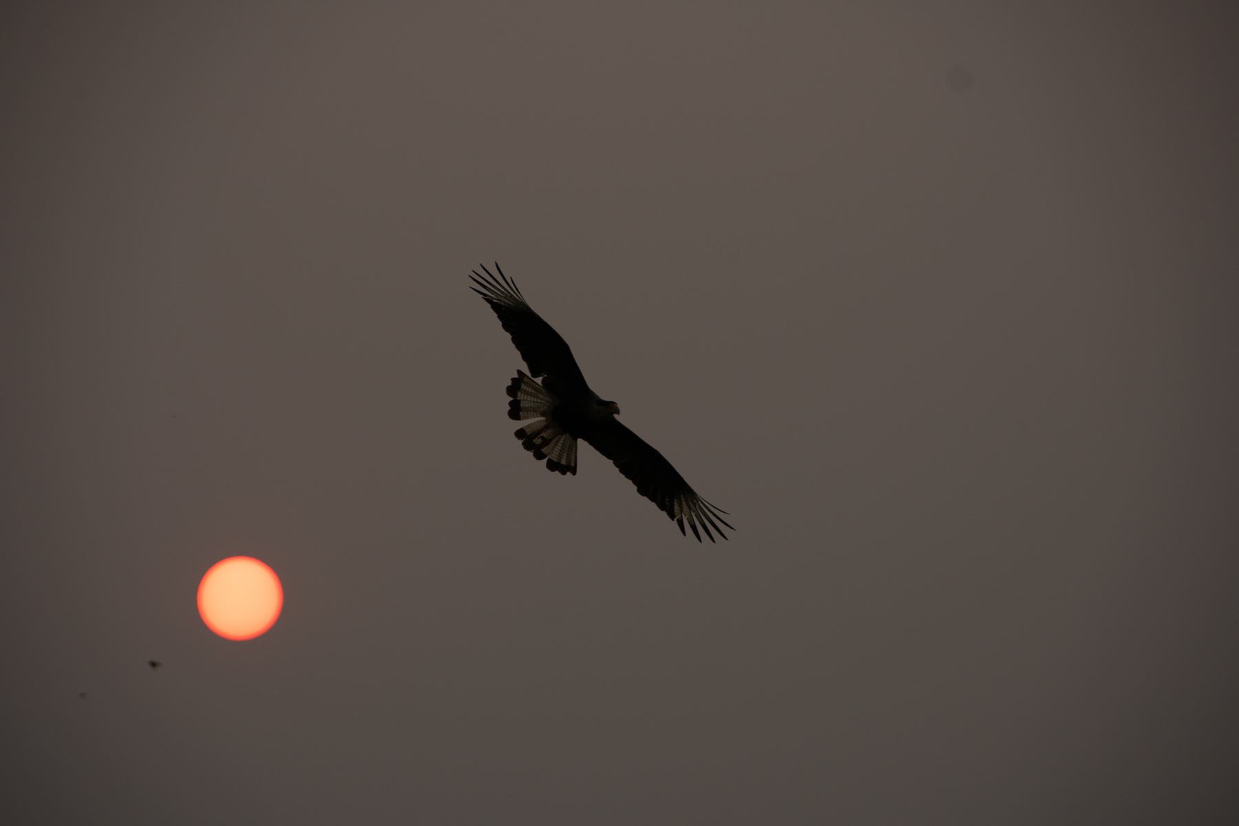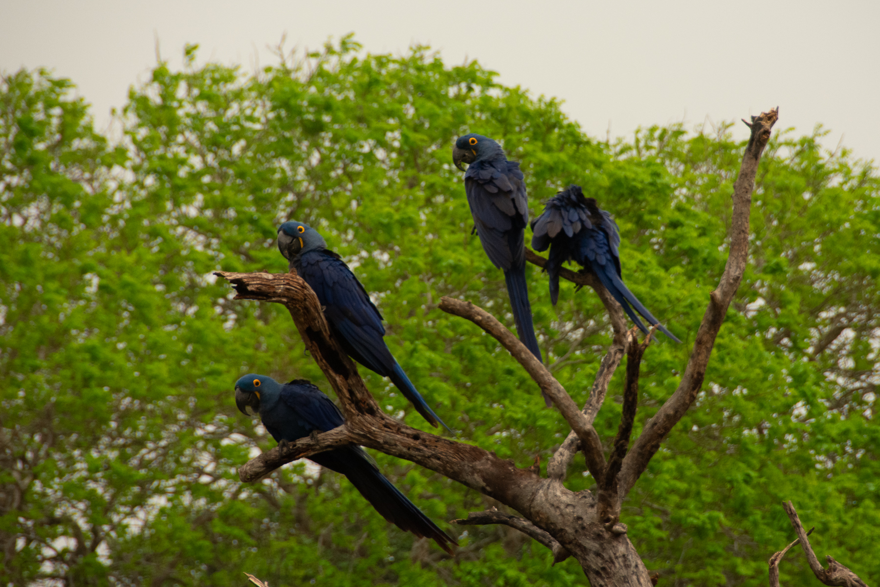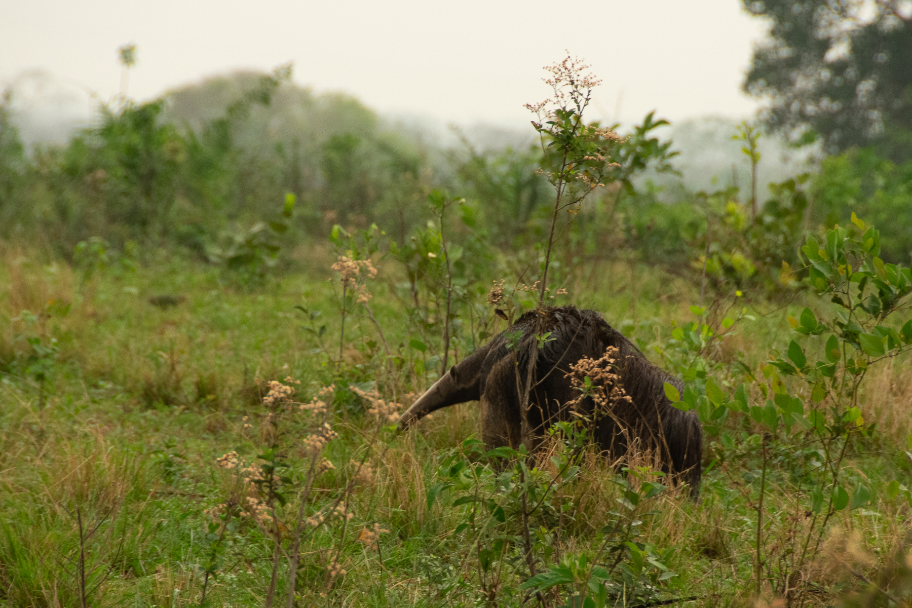 ’s Morgens doen we hetzelfde rondje op de rivier, maar zodra de zon wat hoger aan de hemel staat, wordt het weer goed warm. De zon ziet ook “mooi” rood en verdwijnt soms zelf even, een getuige van de vele rook die in de lucht hangt. De vogels hebben er niet zoveel zin en het blijft daan ook iets rustiger. Wel komen we 2 soorten otters tegen, een gewone (saai, volgens sommige mensen) en 3 reuzeotters. Die laatste zijn vlug terug weg, mogelijks gaan jagen want ze eten 4 kg vis per dag. Hopelijk zien we ze later nog eens. Wel kaaimannen bij de vleet en hier en daar zien we ook een capybara in de zijkant van de rivier zitten. Tegen de middag begint het wat donkerder te worden en net voor de lunch begint het te gieten. Een fijne tropische regenbui, die is hier zeker welkom. De rook is even weg, het koelt wat af en de droge omgeving krijgt wat broodnodig water. Het stopt zelfs net voor onze avondexcursie, dus we kunnen de jeep op en een rondje rijden. Deze heeft echter wel wat dieren doen schuilen, dus het is rustiger dan verhoopt. We spotten wel enkele blauwe arara’s en jagen een kwartiertje tussen de koeien naar wat leuke foto’s ervan. Op de terugweg begint het terug wat te druppelen en net toen iedereen overtuigd was dat het gedaan was, smijt de chauffeur zijn auto in achteruit. In al zijn haast rijdt ie bijna over een gordeldier dat hij nog niet gezien had. Nadat die gevlucht was, mochten we afstappen want er was ook een mogelijkse miereneter gezien. De gids wijst in de richting van een zwarte bult, met moeite te onderscheiden van de andere bulten in de weide. Voorzichtig gaan we de richting uit en ja hoor, een reuzenmiereneter is op zoek naar een mier die niet gaan schuilen is voor de regen. We komen op een tiental meter, voordat hij beslist dat 4 toeristen niet opwegen tegen die ene mier en gaat wat verder zijn zoektocht verderzetten. Wij springen terug op de jeep, waarbij we nog wat in het achterland gaan rondrijden, maar vochtig rood grint blijkt nogal nefast te zijn voor ons voertuig en we keren al vlug terug. Wederom een fantastische dag met mooie spots. Dat het een 10tal graden afgekoeld is, is een extra plus, dan ga ik de airco eens niet nodig hebben om te kunnen slapen.