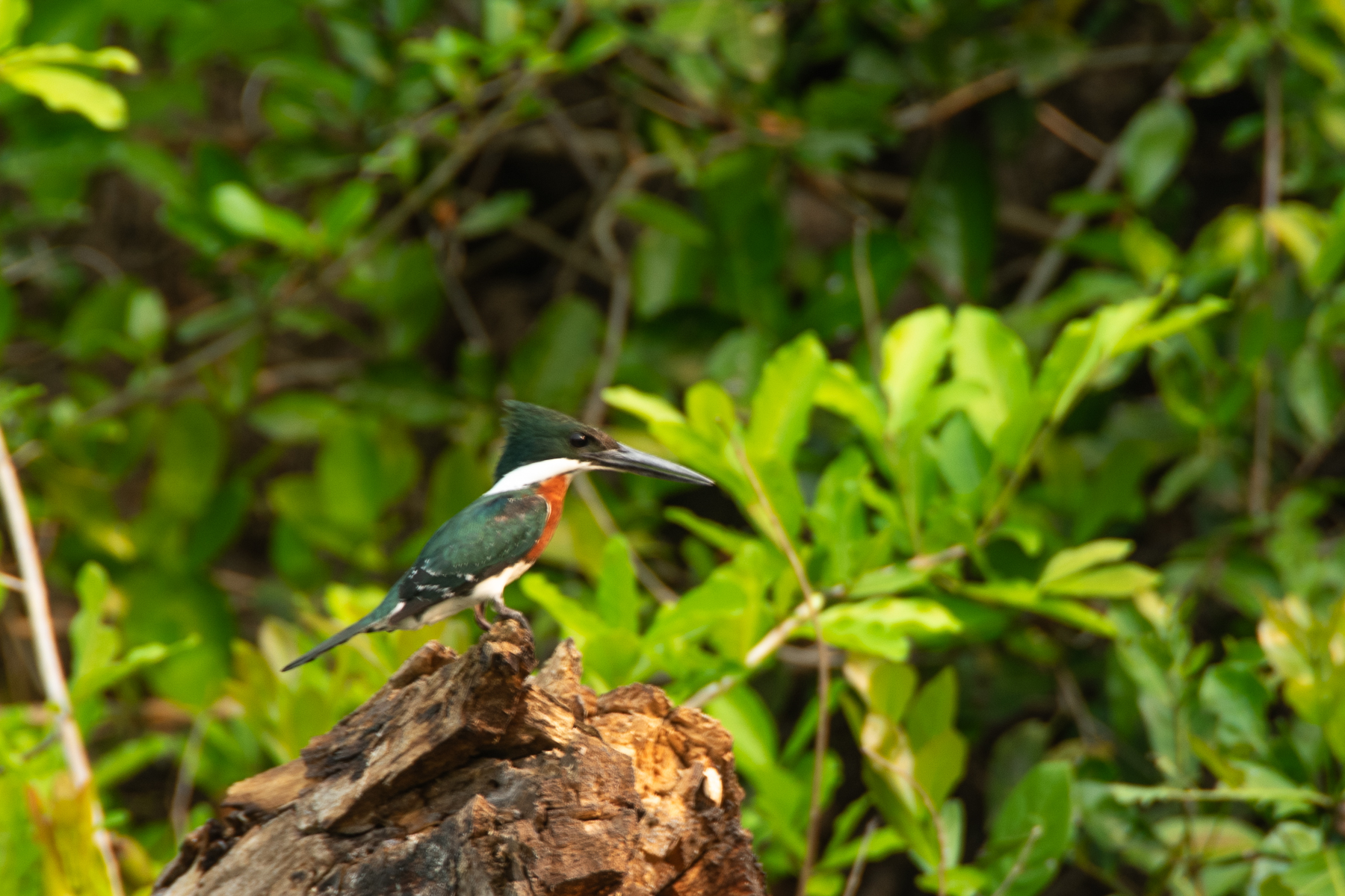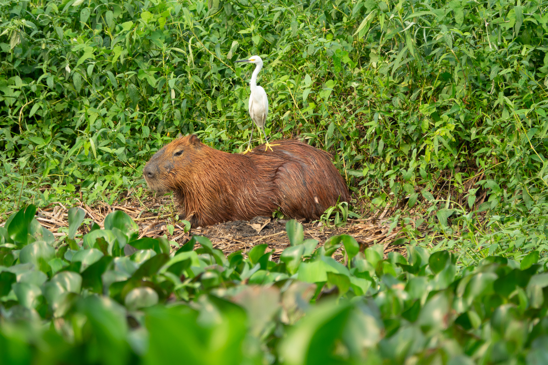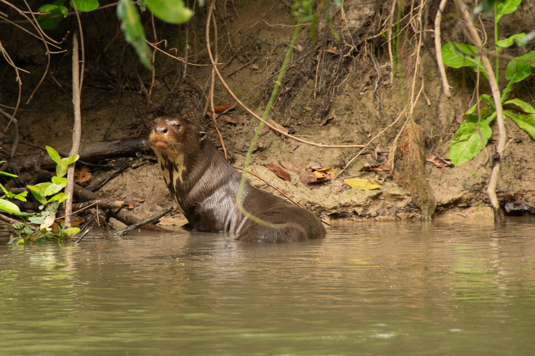 De volgende ochtend is het nog steeds fris, maar de regen heeft de waterpoel wat leger gemaakt. De vogels zijn gaan vliegen, en de kaaimannen zitten meer op het droge dan in het water. En dat is ook het geval als we met de boot stroomafwaarts gaan deze keer. Veel kaaimannen op het droge die met plezier voor de lens poseren. We vinden we een paar zeldzame felgroene vogeltjes, die zich niets aantrekken van de shutters uit het bootje. Ook de roofvogels zijn alom aanwezig, en op hun gemak. Het aantal reigers blijft wel stabiel en elke bocht levert wel een “sock-a-boi” (das mijn uitspraak van het Portugees woord voor tijgerreiger) op. Op het moment dat de gids zegt dat er misschien reuzenotters in de buurt zitten, zie ik wat beweging in de verte. En ja hoor, 3 reuzenotters, gemakkelijk anderhalve meter lang, zijn aan het spelen voor hun nest. De aanwezigheid van een boot zorgt voor wat deining bij deze territoriale dieren en ze laten zich meerdere keren zien. Om het af te maken zit er een kara kara en een ijsvogel in de onmiddellijke buurt, voor de momenten dat de otters zich even terugtrekken in hun nest. Weer een zot mooi ervaring.