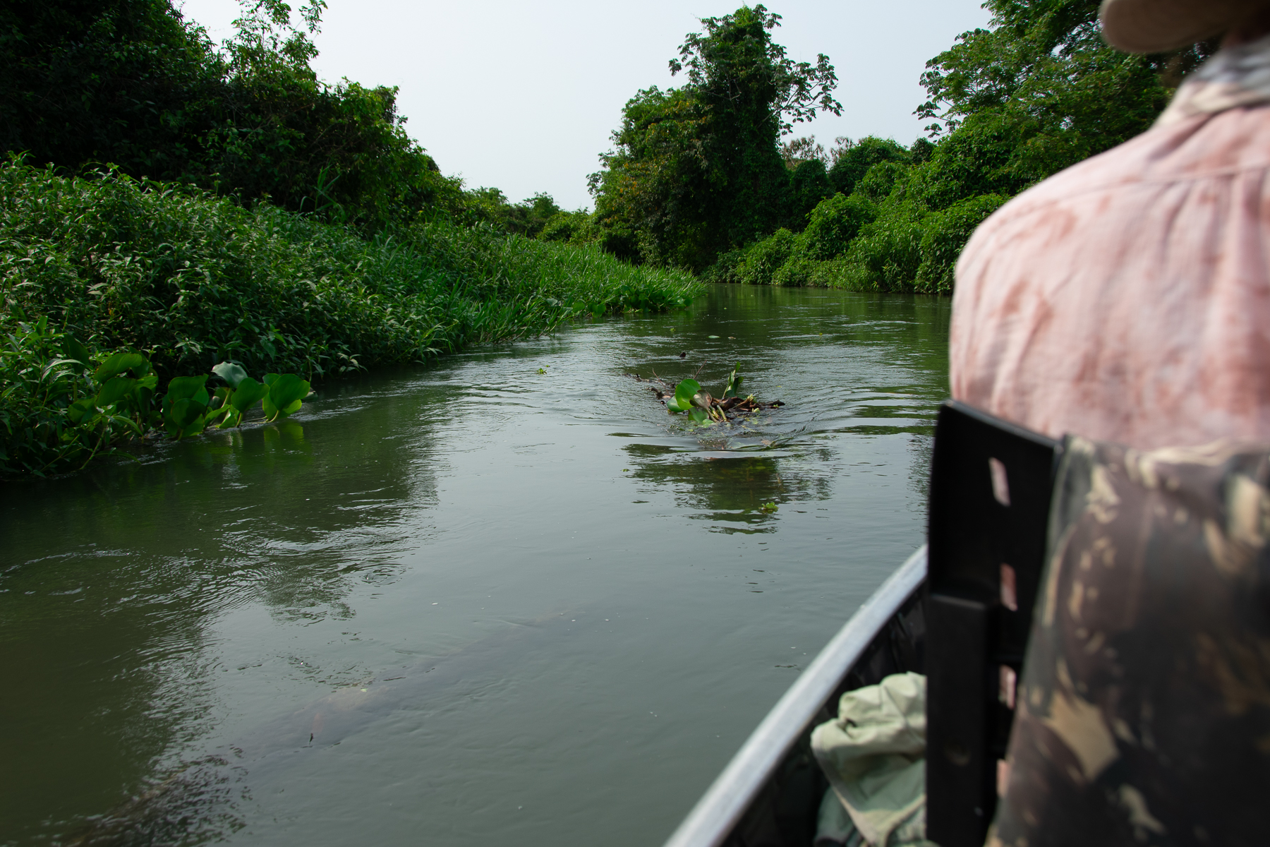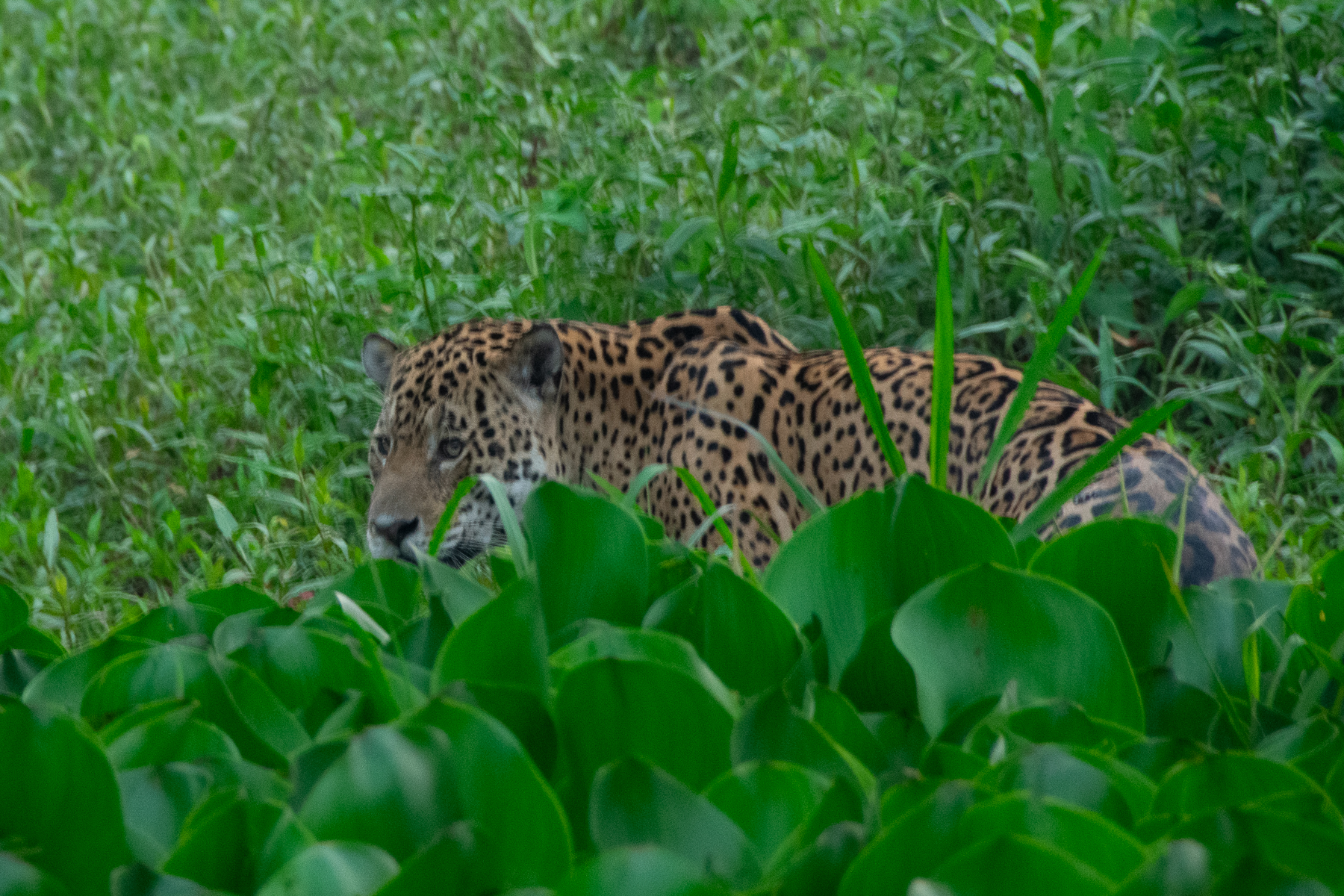 Tegen zonsondergang zijn we vlot bezig aan de terugweg als daar plots een gevlekte kop uit de begroeiing opduikt. We hebben onze eerste jaguar al gevonden! En wat een beest. Het is alle drukte al vlug beu en verdwijnt in het struikgewas, maar blijft langs de rivier, zodat we haar nog even kunnen volgen. Wauws overal rond en met sterretjes in de ogen zoeven we in het donker terug naar de poussada. De trip is nu al een onverhoopt succes, want jaguars in het wild spotten, das helemaal niet voor de hand liggend.