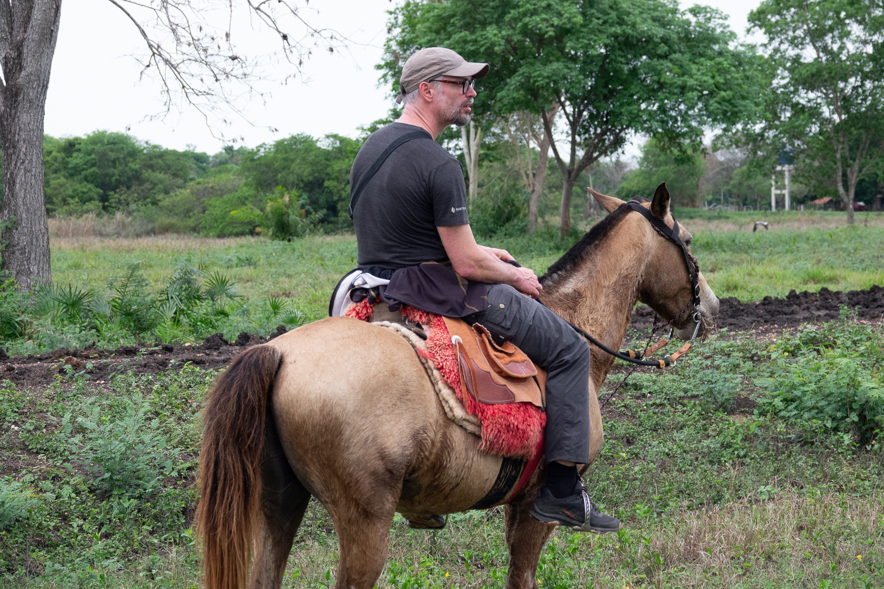Bij de lunch wordt er meegedeeld dat we in de namiddag een safari te paard gaat doen, want de stress bij mij een klein beetje doet toenemen, want ik heb niet meer op een paard gezeten sinds een paardekamp 30 jaar geleden. In de namiddag wandel ik even tot bij de paardenweide en probeer ik de paarden eens te aaien, maar die zijn niet geinteresseerd. Hopelijk is dat geen slecht teken. Ik word gerustgesteld door Pieter en de gids want het zijn paarden die gewoon zijn aan de tocht en aan toeristen zonder kennis. Pieter heeft minder sjans, want die krijgt een jong paard met redelijk wat pit, hij is dan ook de enige die wel verstand heeft van paarden. We sjokken door het bos, maar daar is er weinig beweging. We spotten wel een hert, maar ik leer al vlug dat een foto nemen vanop de rug van een paard gemakkelijker gezegd is dan gedaan. In het bos gaat het achter mij plots mis, als er een paard licht op hol slaat en ervandoor gaat met een Braziliaanse tochtgenoot. Ook Pieter heeft de grootste moeite om zijn paard kalm te houden, tot plots duidelijk wordt, dat er in een wespennest getrapt is geweest door een paard. Pieter kan het getuigen door enkele steken in zijn achterhoofd, leuk is anders. Verder geen schade, maar voor de zekerheid verlaten we het bos en keren terug via de weiden. Daar zien we wel nog een vos, die aan het jagen is op de eieren van een kievit koppel in de buurt. Ze laten zich beiden niet afleiden van onze aanwezigheid en we kunnen een eindje kijken naar het schouwspel.