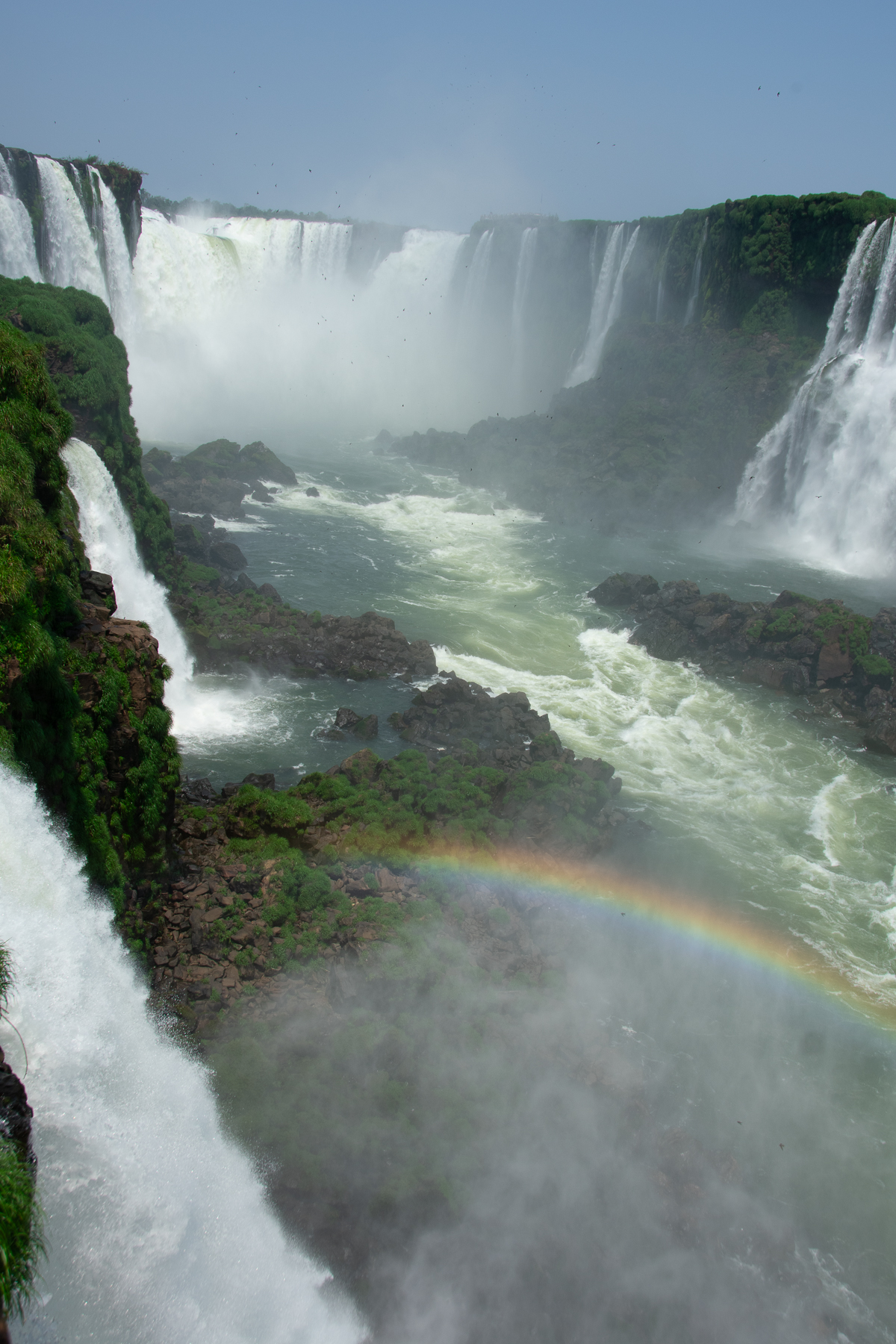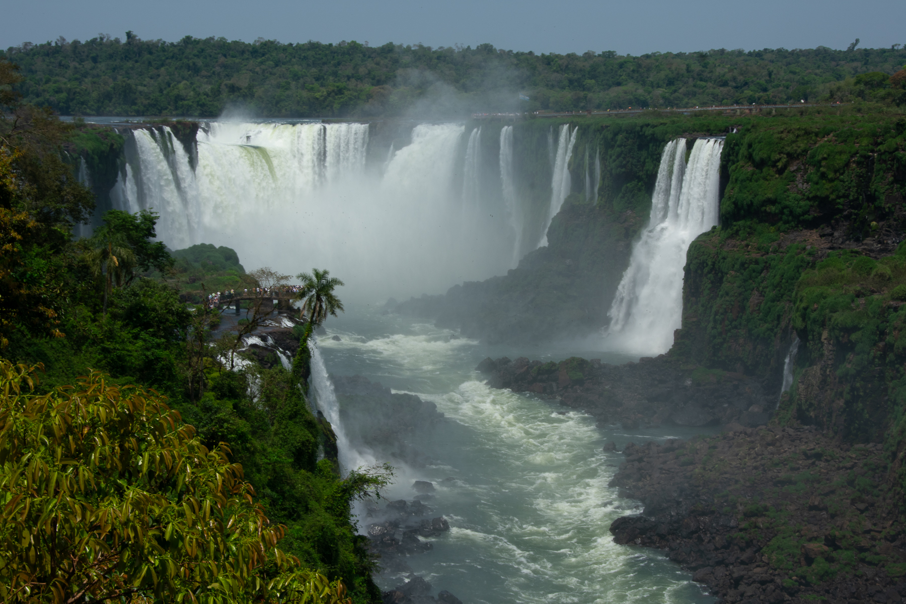 De volgende ochtend sta ik om 6u30 al aan het ontbijt, want om 7u gaat de rit richting Argentinië. De taxichauffeur spreekt Portugees en Spaans, maar een vlot gesprek blijft uit. Aan de Braziliaanse kant krijg ik een stempel, aan de Argentijnse kant wordt het gewoon gecontroleerd, of dat vermoed ik toch want ik zie niet wat er gebeurt in het hokje waar mijn paspoort in verdwijnt. Beetje later sta ik aan het loket om een ticket te kopen, even wachten tot het park open gaat en dan een spurtje naar de trein. 4 km verder van de trein af en als een van de eersten naar de Garganta del Diablo. Ik zag gisteren van de Braziliaanse kant veel volk staan daar, dus zou het liefst genieten van de waterval als het nog wat rustig is. Ik ben natuurlijk niet alleen met dat idee. Zo dicht bij de waterval, voel je de kracht ervan. Indrukwekkend hoeveel water er daar naar beneden gaat. Ik hang er een half uurtje rond, totdat het volk mij teveel word. In plaats van het treintje terug, ga ik te voet, wat net iets aangenamer is. Bij het volgende station waag ik mij eerst aan het “sendero superior”, dat bovenaan de watervallen passeert. Mooi, maar de bovenkant is meestal niet de mooiste kant van een waterval. Dus dan direct door naar “sendero inferior”. Eerst even een blik op de Garganta, van wel heel ver nu, daarna een beter zicht op de Argentijnse kant.