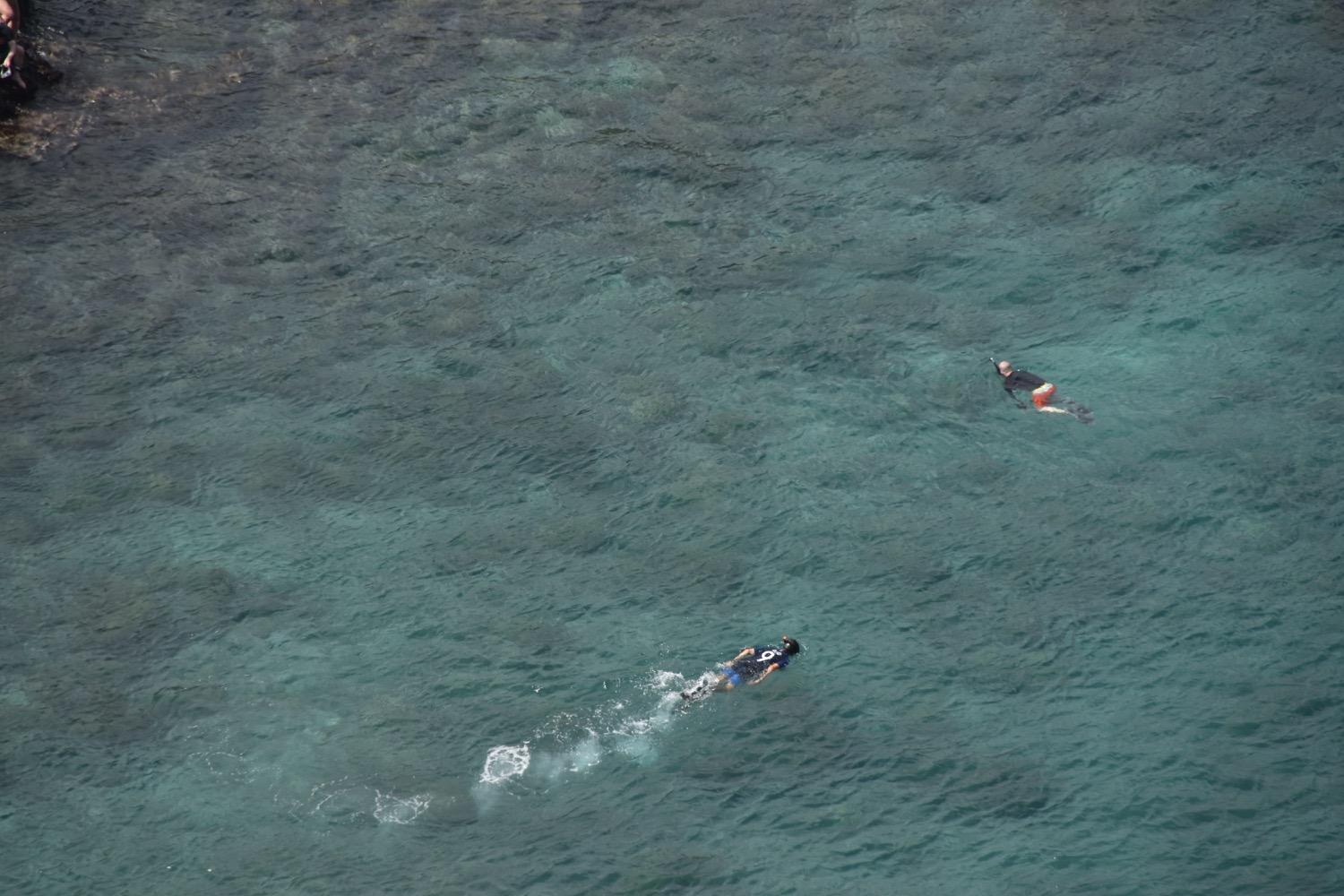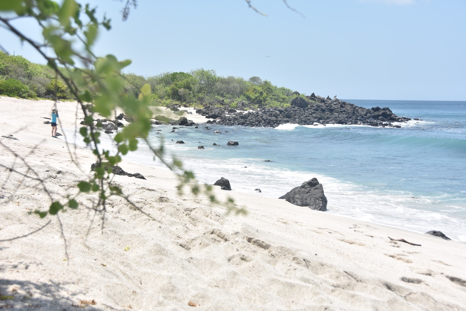 De dag erna is een snorkeldagje. Eerst was gaan afgeven en een duik naar Kicker Rock boeken, dan masker en snorkel huren en te voet op weg. Al vlug blijkt dat het weer op San Cristóbal iets weg heeft van Isabela: heet en branderig. Eerst naar La Loberia, daar effe aanmelden en direct het water in. Helaas is er hier (momenteel?) niet zoveel te zien. Dus terug het water uit en wat opdrogen onder een struik, zoals de locals. Na een uurtje pak ik mijn boeltje in en wandel ik de lange weg terug, voorbij de stad, en naar Tijeretas, waarvan ik weet dat het goed snorkelen is. Ik moet tot aan het eind van de baai zwemmen, maar daar kom ik een stingray, een schildpad en een speelse zeeleeuw tegen. Daarna verder naar het verste strand dat te voet bereikbaar is. De weg ernaartoe blijkt moeilijker te zijn dan gedacht, over scherp vulkanisch gesteente en door mangrovebossen. Mooi, en bij aankomst blijkt het strand ook een voltreffer. Weer een plaatsje onder een struik gevonden en vandaar wat observeren. Totdat ik af en toe kopjes boven water zie komen. Bij nader onderzoek blijken het schildpadden te zijn en zo te zien zijn ze met veel. Dus snorkel en masker op en hup het water in. Veel rotsen maken de entry niet gemakkelijk, maar al vlug ben ik omringd door schildpadden die in de stroming aan het eten zijn. Domweg mijn gopro vergeten natuurlijk, dus even terug, gopro mee, en terug het water in. Samen met de schildpadden word ik door de golven heen en weer gegooid, ondertussen wat foto’s en filmpjes van de schildpadden aan het maken. Mooi zicht toch weer! ‘s Avonds nog een visje gaan eten en dromen van hamerhaaien.