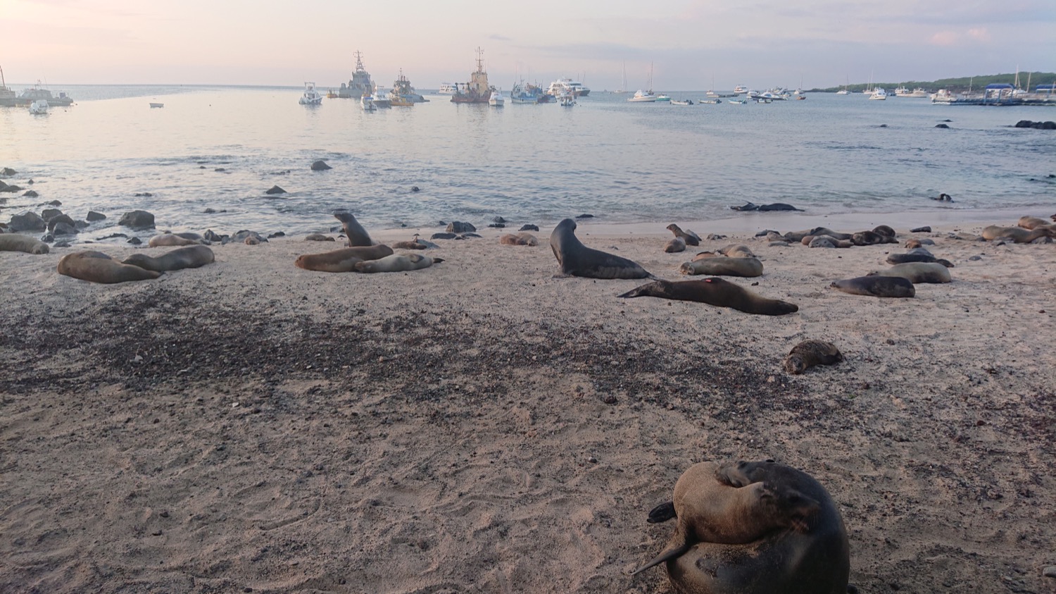 De laatste dag op San Cristóbal, en op de Galapagos, spendeer ik zoals de eerste dag. Eerst wat snorkelen aan Tijeretas, dan naar Playa Baquerizo, waar de schildpadden nog altijd aanwezig zijn, beetje slapen, dan terug naar guesthouse en dan nog vlug eens naar La Loberia, om te gaan zien naar het vogelkijkpunt. Beetje later dan verwacht, zet ik een spurtje, om tot de constatie te komen dat er niets te zien is. De vogels zijn gaan vliegen. Tijdens het spurtje terug komt de parkwachter me al tegemoet, want “cerrado a las seis”. Ik maak nog vlug wat zonsondergang foto’s vooraleer samen met de gezapige locals weggejaagd te worden. ‘s Avonds vind ik nog een BBQ plaatsje, aangeraden door Canadezen, waar ik diezelfde Canadezen tegenkom. Dan voor de laatste keer gaan slapen op de Galapagos. *snif*