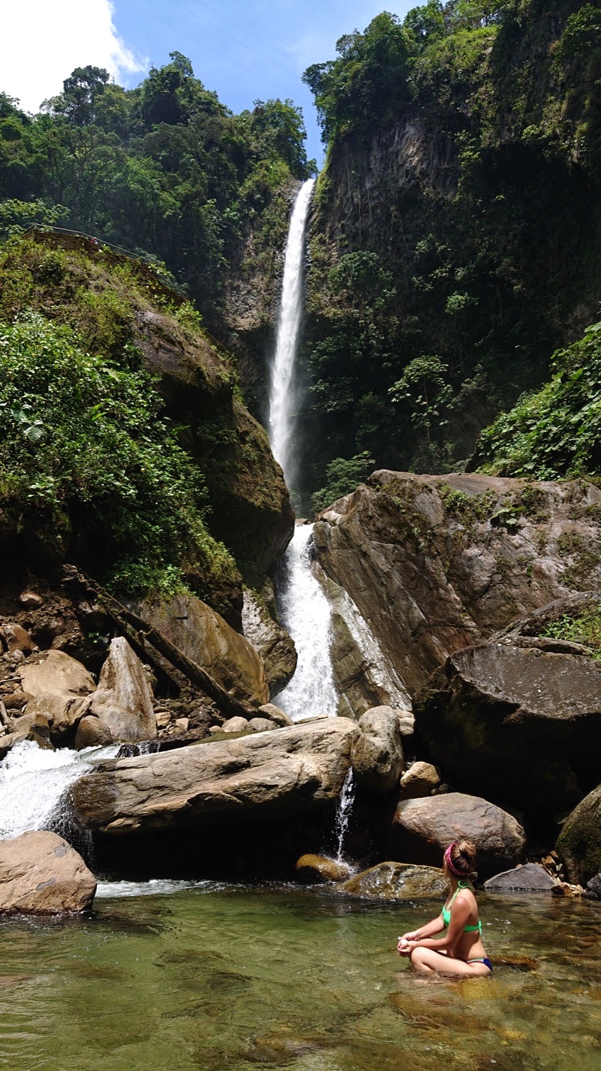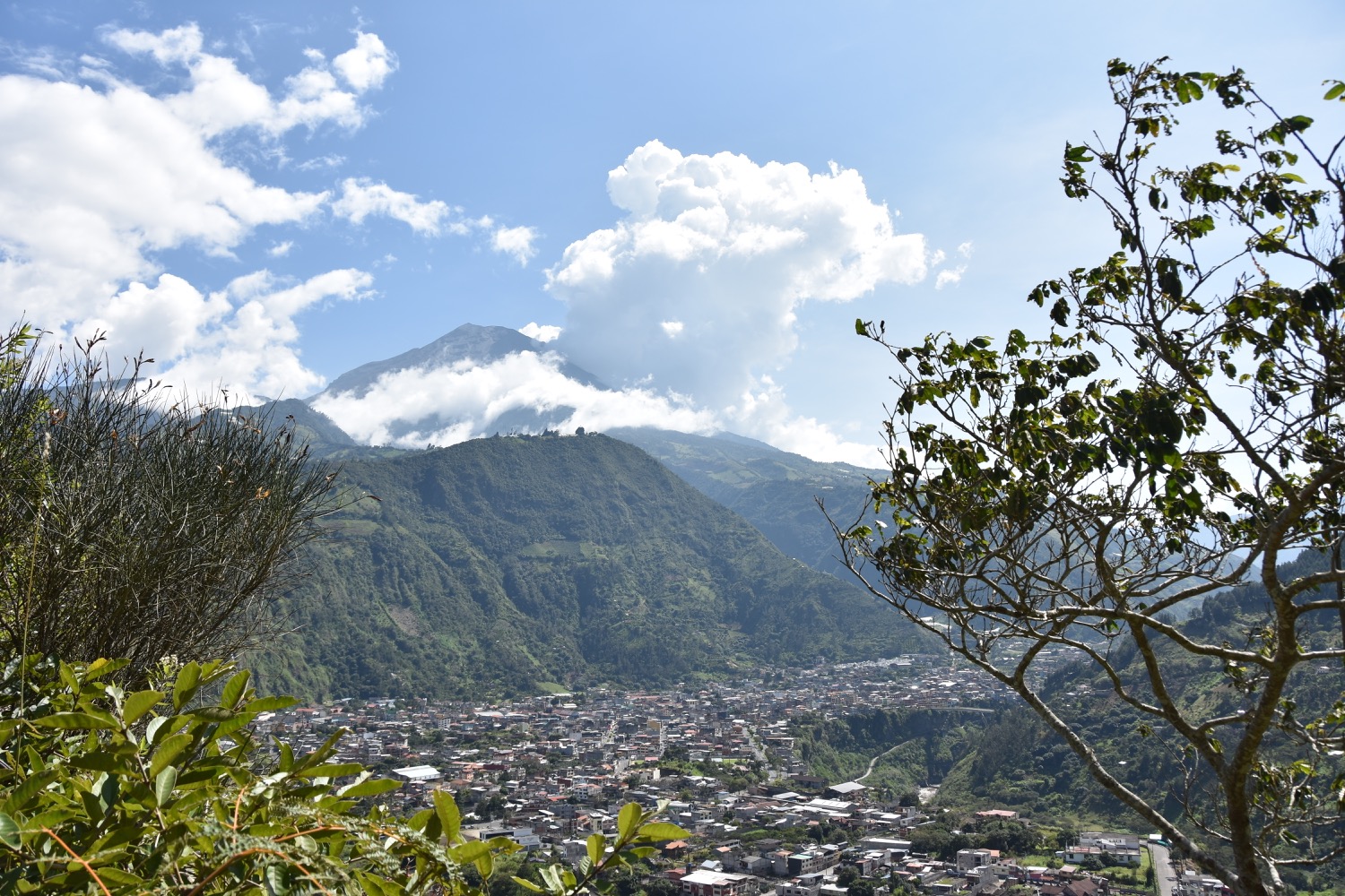 ’s Morgens besliste ik om aan canyoning te doen, nadat een Duitser in de slaapzaal me erover verteld had. Dat was best leuk, ook al waren de canyons klein en was het rappelen weinig nieuw voor mij. De laatste waterval was de beste, want daar liet de gids je in 10 meter in vrije val alvorens die te blokkeren. Een beetje vertrouwen in de gids was wel nodig, want ik zag nergens een veiligheid. Volgende keer breng ik toch mijn eigen prussik en musketon mee, denk ik. Na een bordje Llapingachos op de markt, deed ik nog een kleine wandeling aan de overkant van de rivier met Johannes (dezelfde Duitser). Daar kregen we de vulkaan te zien die naast het dorp ligt. De laatste uitbarsting was nog maar een paar jaar geleden, maar het dorp blijft elke keer gespaard, waardoor de mensen denken dat het beschermd wordt.