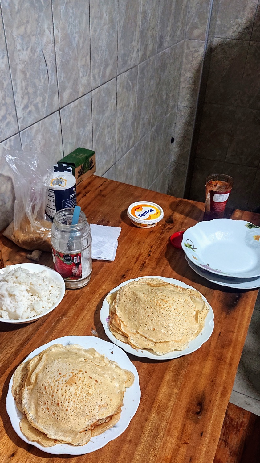 Het is zondag vandaag, ik heb het opgezocht. Dus de bloem en melk van gisteren gaan samen met een hoop eieren in een pot en boem, pannekoekendeeg. De voorzieningen zijn hier niet zoals thuis, maar ik krijg het voor elkaar. De eerste pannekoeken zijn nog wat aan de bleke kant, want ik moet leren werken met het vuur en de pan, maar daarna gaat het vlot. Tijdens het bakken kan ik al wat pannekoeken uitdelen aan de andere gasten, maar ik leef toch het meest voor het moment dat alles gebakken is en ik er zelf ook kan aan beginnen. Heta heeft ondertussen een appeltje gebakken, dus er is voldoende keuze aan beleg. Na eentje met gebakken appeltjes, ga ik voor mijn persoonlijke favoriet zijnde suiker (panela) met limoen, om af te sluiten met eentje met confituur. Om er dan nog een paar te eten als dessert, en eentje met rietsuiker om het af te leren.